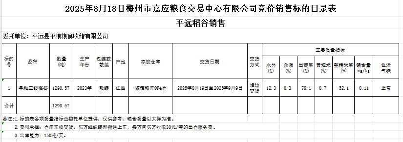 受客戶委托,梅州市嘉應糧食交易中心有限公司定于2025年8月18日(星期一)舉辦糧食競價交易會。平遠縣平糧糧食收儲有限公司擬銷售2023年產早秈稻谷1290.57噸。