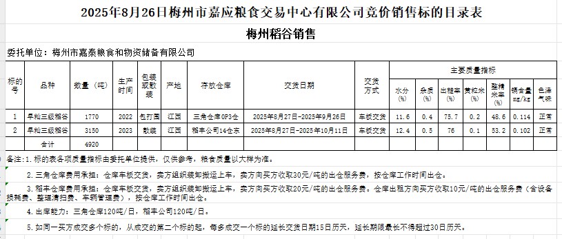 受客戶委托,梅州市嘉應(yīng)糧食交易中心有限公司定于2025年8月26日(星期二)舉辦糧食競(jìng)價(jià)交易會(huì)。梅州市嘉泰糧食和物資儲(chǔ)備有限公司擬銷售2022年、2023年產(chǎn)早秈稻谷4920噸。