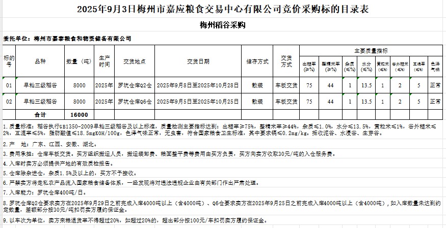 受客戶委托,梅州市嘉應糧食交易中心有限公司定于2025年9月3日(星期三)舉辦糧食競價交易會。梅州市嘉泰糧食和物資儲備有限公司擬采購2025年產早秈稻谷16000噸。