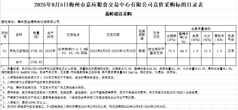 受客戶委托,梅州市嘉應糧食交易中心有限公司定于2025年9月5日(星期五)舉辦糧食競價交易會。蕉嶺縣金穗糧食收儲有限公司采購2025年產早秈稻谷3706.93噸。