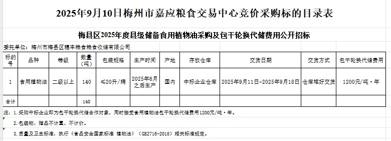 受 梅州市梅縣區穗豐糧食糧食收儲有限公司委托,梅州市嘉應糧食交易中心有限公司定于2025年9月10日(星期三)上午10:00在廣東省梅州市彬芳大道南161號梅州市糧食交易中心3樓,舉辦梅縣區2025年度縣級儲備食用植物油采購及包干輪換代儲費用公開招標公告。