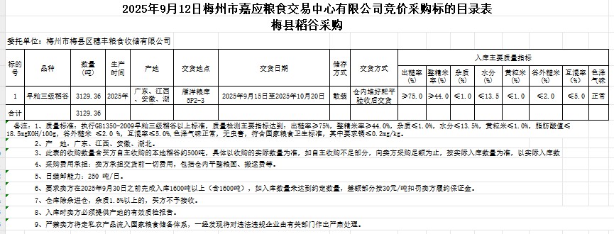 受客戶委托,梅州市嘉應(yīng)糧食交易中心有限公司定于2025年9月12日(星期五)舉辦糧食競(jìng)價(jià)交易會(huì)。梅州市梅縣區(qū)穗豐糧食收儲(chǔ)有限公司擬采購2025年產(chǎn)早秈稻谷3129.36噸。