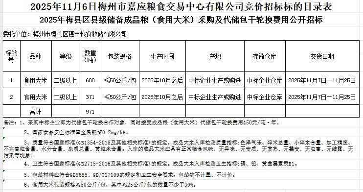 梅縣區2025年縣級儲備成品糧(食用大米)采購及代儲包干輪換費用公開招標公告